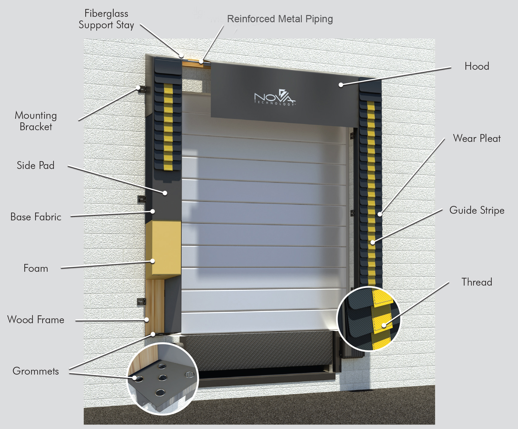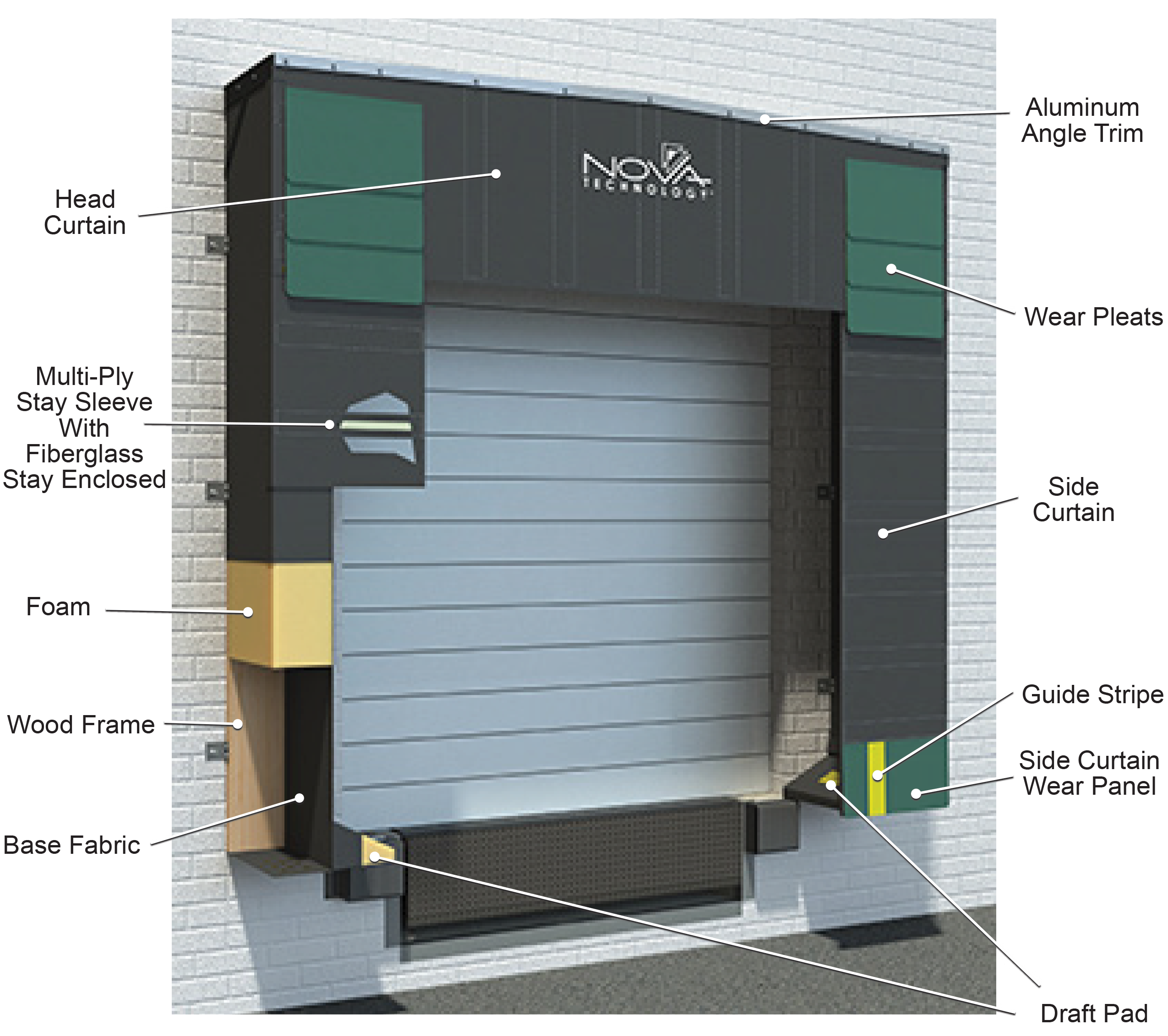 FPH Series Dock Seal—features a hood-style head curtain in place of a head pad with a metal pipe and fiberglass stays in the fabric hood to maintain support and serviceability.