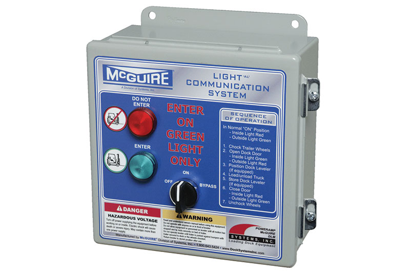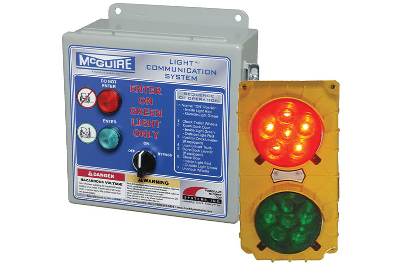 The McGuire Dock Alert communication system is a simple, reliable, and cost-effective lighting system. These exterior lights are standard with LEDs for extended life. The innovative single light shows a flashing Red X and a Green O to enhance safety and efficiency. The enhanced dock alert light communication provides a reliable warning system that establishes a clear line of communication between truck drivers and dock personnel, thereby reducing the risk of accidents at the loading dock.