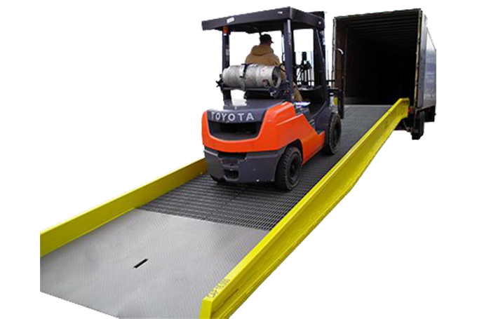 The yard ramp allows for traffic to move from the dock level down to the ground or from the ground up into the back of a truck. The ramp can be moved around your shipping yard easily to have you ready in minutes to begin loading/unloading.