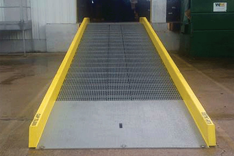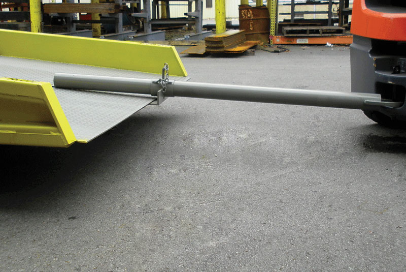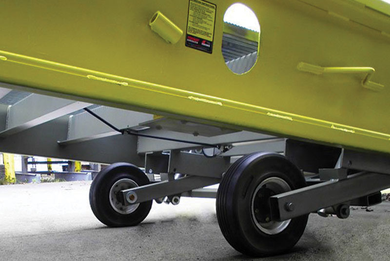 The yard ramp allows for traffic to move from the dock level down to the ground or from the ground up into the back of a truck, which helps loading/unloading flow smoothly. The 18” industrial solid rubber pneumatic tires allow for easy movement of the ramp around your shipping yard to have you ready in minutes to begin loading/unloading. The hydraulic adjustment system permits fast reliable height adjustment of the yard ramp with virtually any trailer bed height.