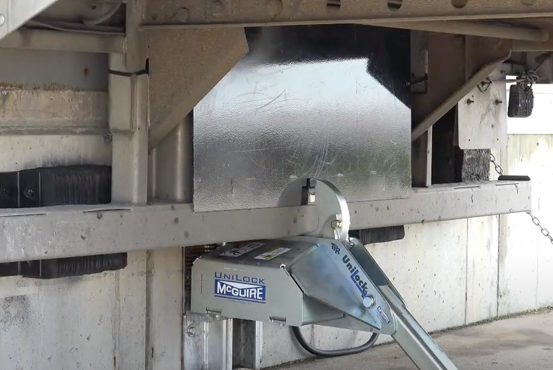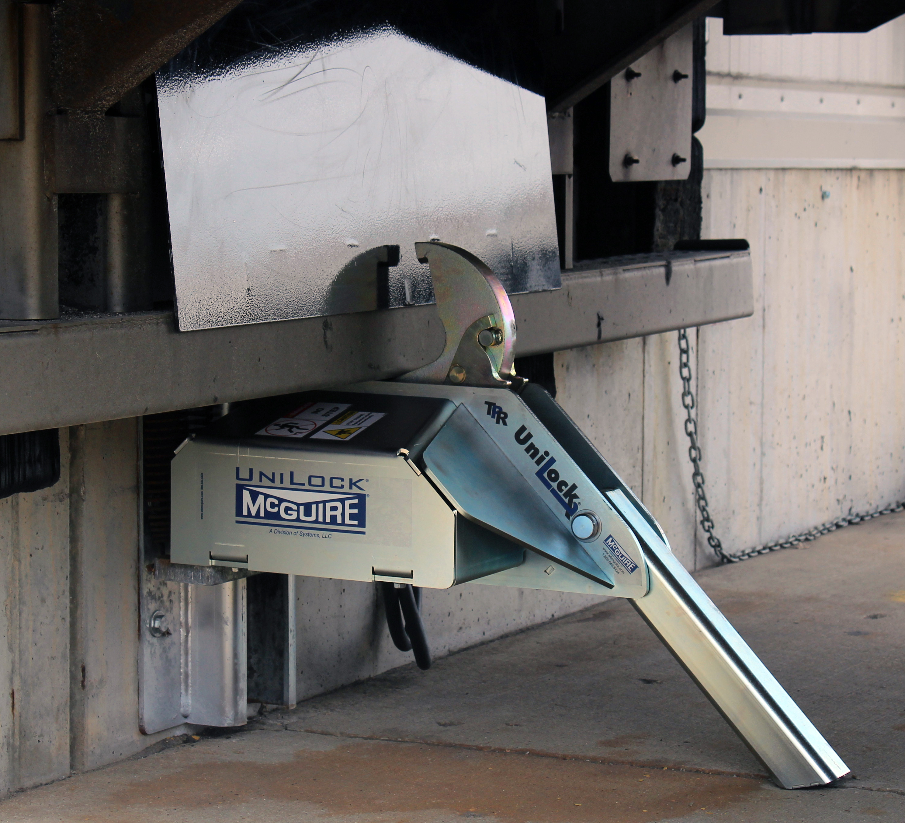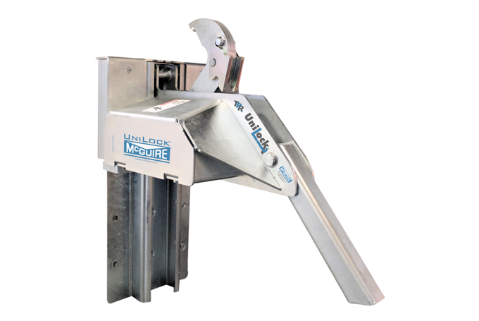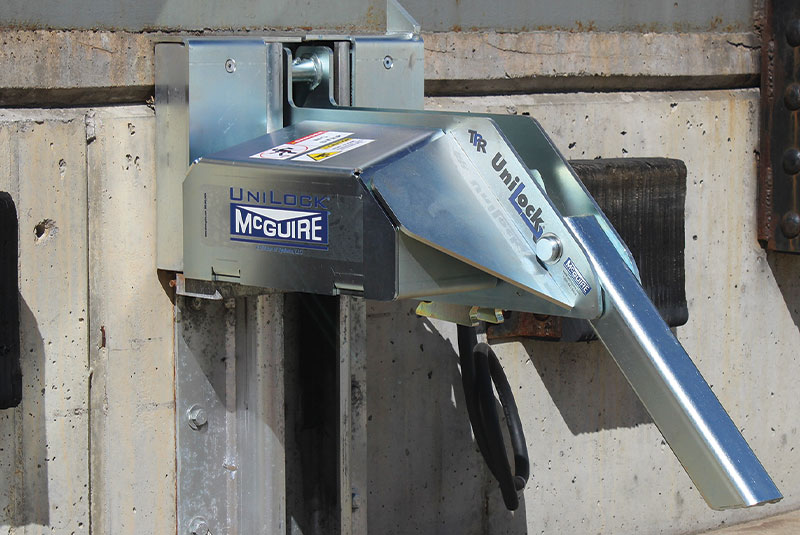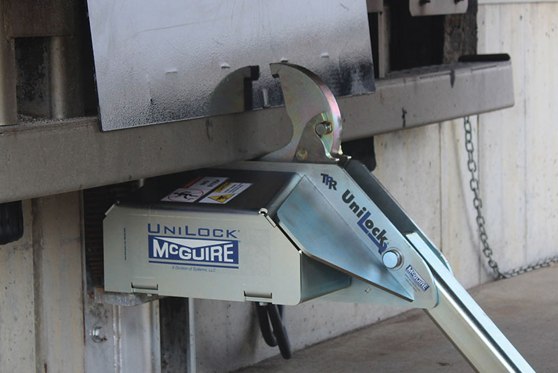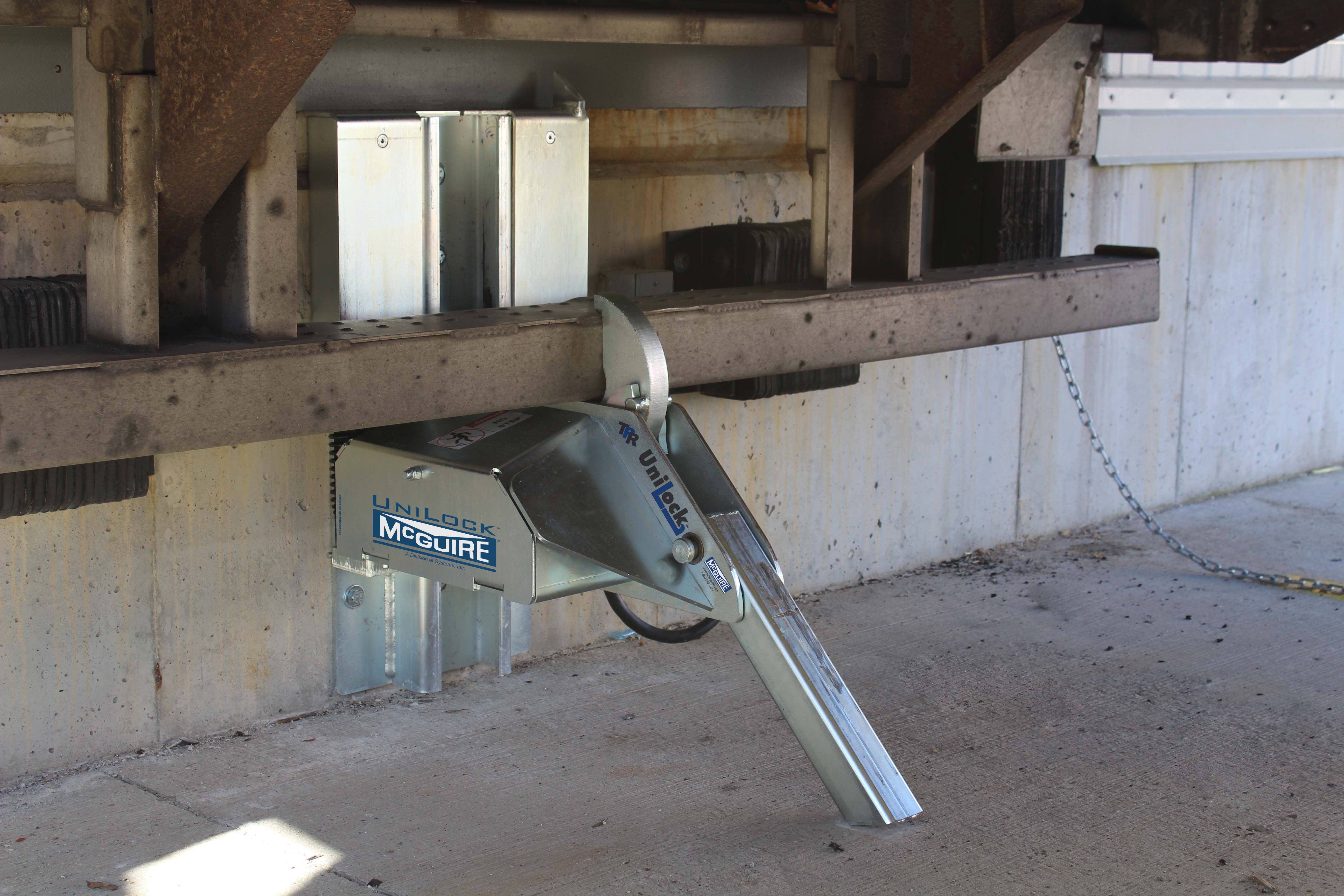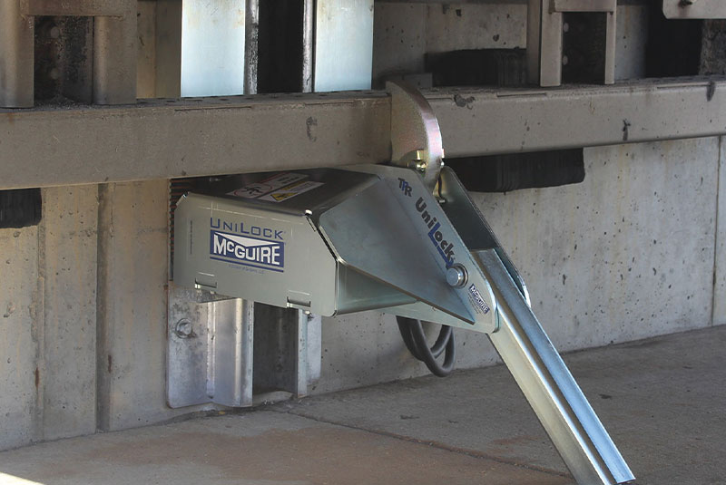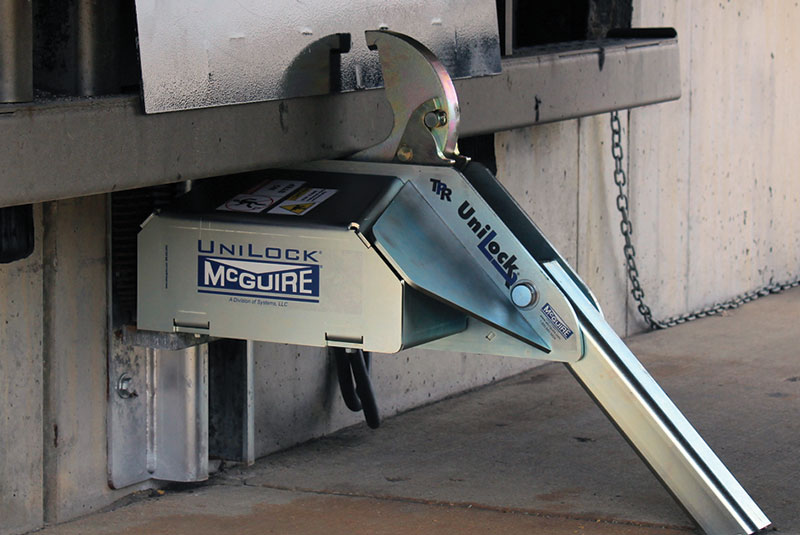 The UniLock vehicle restraint also has an internal safety mechanism that locks the restraint's hook in place when pressure is applied, maintaining a secure engagement. This makes it universally effective on any obstructed Rear Impact Guard (RIG), including intermodal trailers with cover plates that prevent the restraint's hook from latching on top of the RIG.