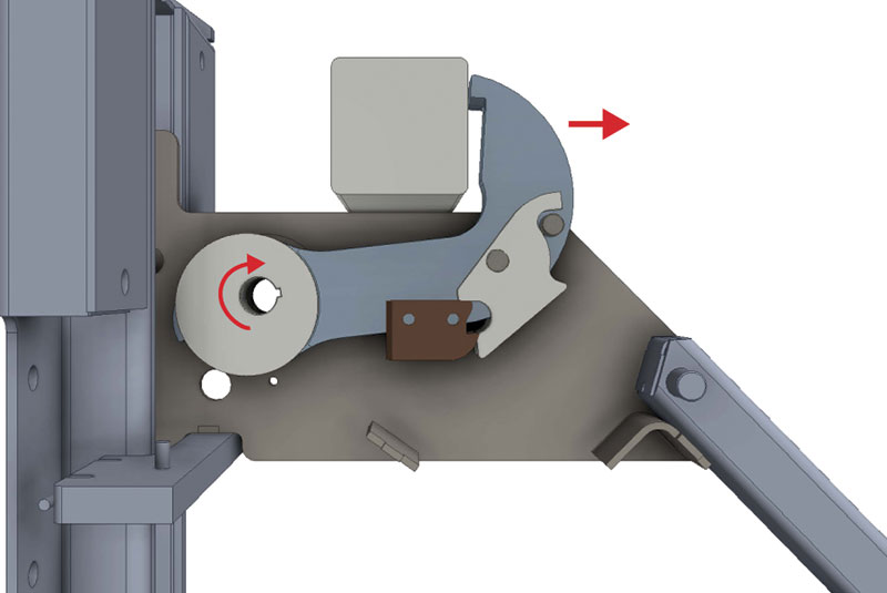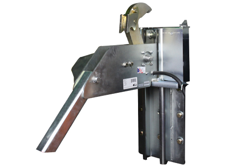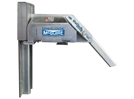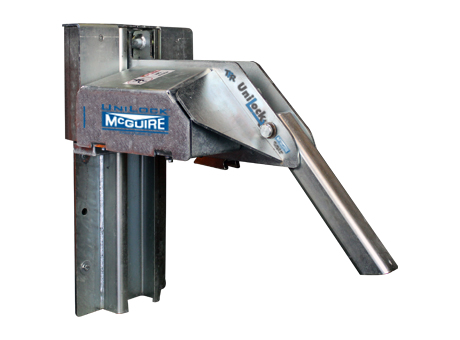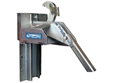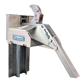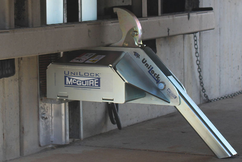 The TPR UniLock® is the only trailer-positioned vehicle restraint that can automatically remove "RIG Wedge" pressure. RIG Wedge is caused when the trailer is pushed forward during loading/unloading and the trailer's Rear Impact Guard (RIG) applies so much pressure to the restraint's hook that the truck driver must reverse the trailer in order to release the restraint. The UniLock has an advanced cam design that first rotates the hook away from the RIG to remove the pressure and then rotates down to a stored position.