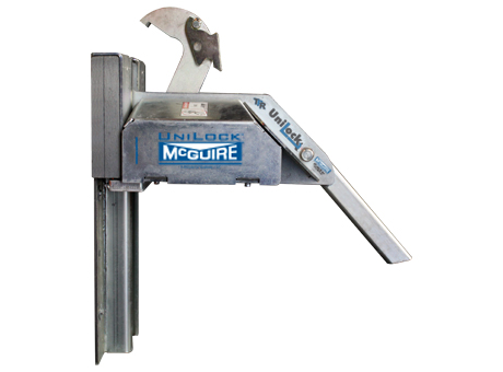The UniLock is designed to withstand a pulling force in excess of 32,000 lbs and has a service range of 4” to 10” horizontally from the face of the dock bumpers and 9” to 30” vertically above the drive approach. The integral motor, gear, and brake assembly are specifically designed for the UniLock. The UniLock vehicle restraint is highly adaptable to new or existing loading docks.